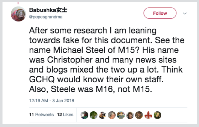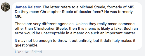 「TOP SECRET」という文書を作成した者が、ソースの名前まで記載するという不注意を犯したとしても(その可能性は低いですが)、自国政府との通信で、スティールのファースト・ネームと所属を両方間違えることはあり得ないでしょう。