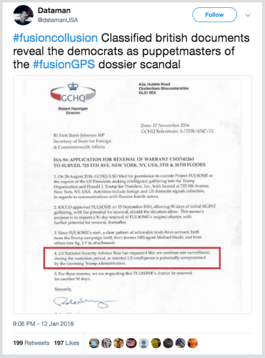2018年1月12日、同じパターンが繰り返されました。別の匿名で過激な党派支持者である@datamanUSAが、スティールが勤務していた情報収集会社Fusion GPSをほのめかすハッシュタグ「#FusionCollusion」を付けてそれを投稿しました。この投稿は200回近くリツイートされました。