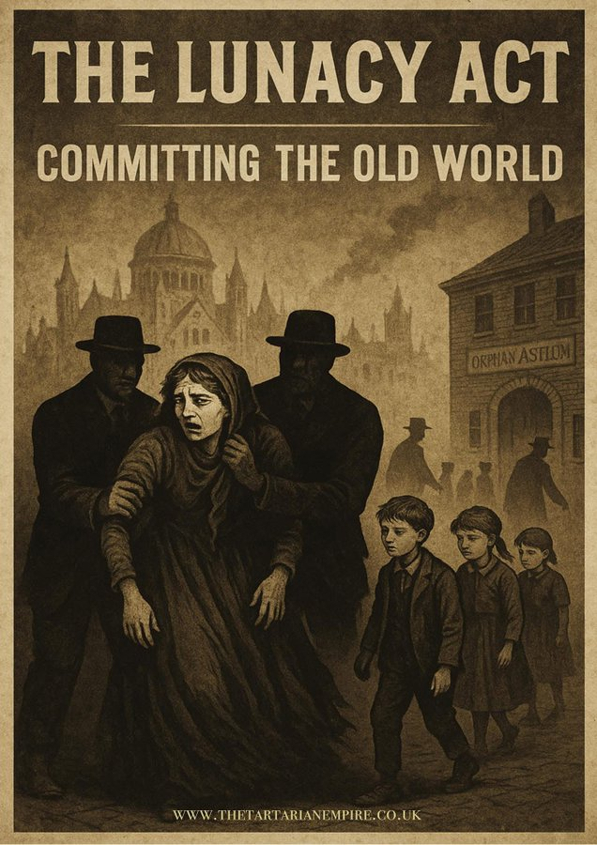 狂気法とは、決してケアや思いやりによるものではありませんでした。それは、過去を消し去り、未来を支配し、そのルーツから切り離された国民を作り出すために計算された武器でした。このプロセスを通じて、寄生虫たちは19世紀後半までに、別の歴史が葬られ、タルタリアが忘れ去られ、その世代全体が、彼らに教え込まれた現実だけを信じるように成長することを確実にしました。