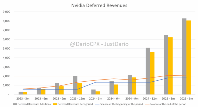 - それでは、改めて表をご覧ください。過去6か月間において、Nvidiaの繰延収益勘定は約2億米ドルしか増加していませんでしたが、直近の6か月間では約80億米ドルの繰延収益が計上され、その後、ほぼ同額が同期間内に即時に収益として認識されました。