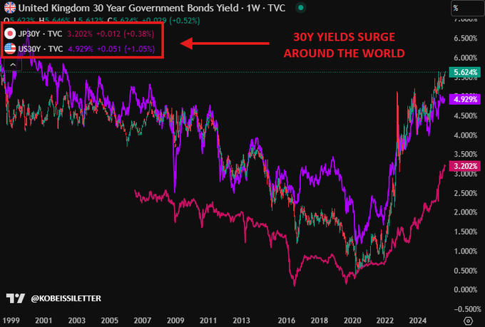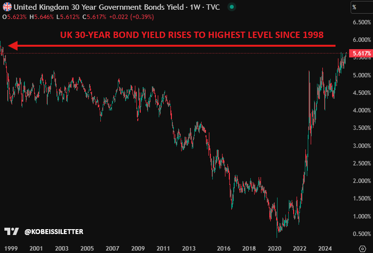 本日、英国の30年物国債利回りは5.64%まで上昇し、1998年以来の最高水準を記録しました。