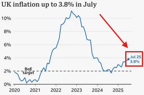 英国の消費者物価指数(CPI)インフレ率は7月に3.8%に達し、8月には4%超に達する見込みです。