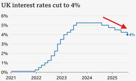 赤字財政が急増し、インフレが再燃しているにもかかわらず、イングランド銀行は金利を引き下げており、現在は4%まで低下しています。