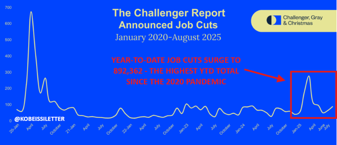 さらに、Challenger社のデータによると、2025年8月単月での雇用削減数は88,736人増となり、2020年以降で最も高い8月の数値となりました。