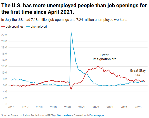 米国では、2021年4月以来初めて、求職者数が求人数を上回りました。