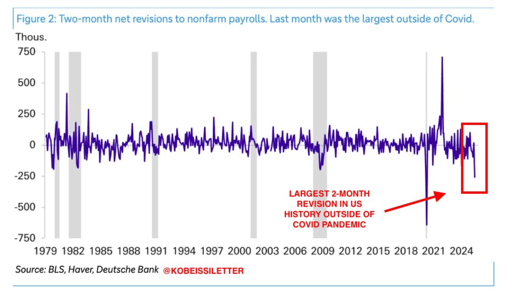 米国では、6月2025年の雇用統計が二度目の改定を経て、当初の「14万7000人増加」から「1万3000人減少」へと修正されました。