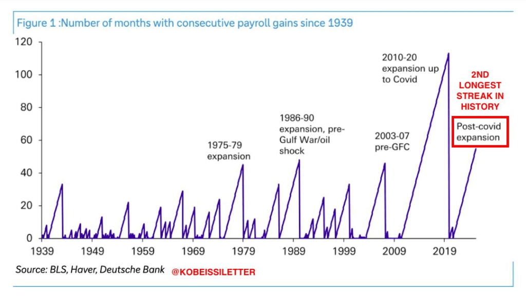 COVID後の景気拡大期には、60ヶ月以上にわたり雇用者数が連続して増加し、これは史上2番目に長い記録でした。