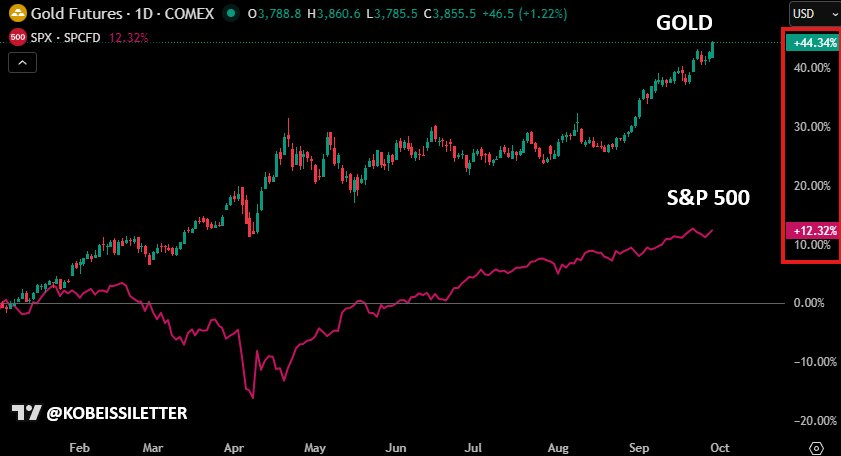 これは、史上最も強い上昇相場の一つにおいて、金がS&P500の3.5倍の上昇率を記録したことを意味します。