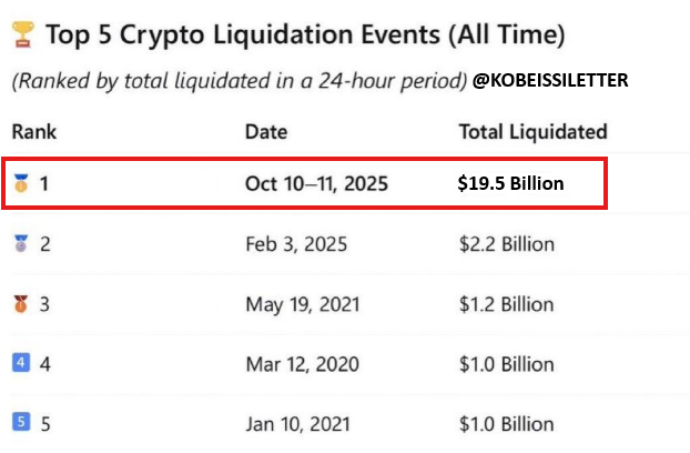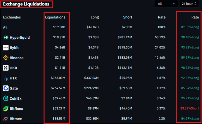 24時間で190億ドル相当のレバレッジをかけた暗号資産ポジションが清算され、これは過去最高記録の9倍に相当します。