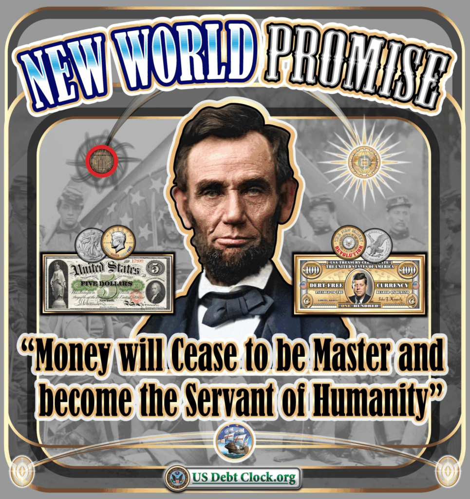 リンカーンは、FRBの借用証書ではなく、主権的な米国紙幣に囲まれています。これらは憲法に基づく通貨であり、債務がなく、政府自らが発行するものです。これは、民間バンキング・カルテルが制度を乗っ取る前の姿です。米国債務時計は単なる図表ではなく、戦いの叫びを掲げたのです。