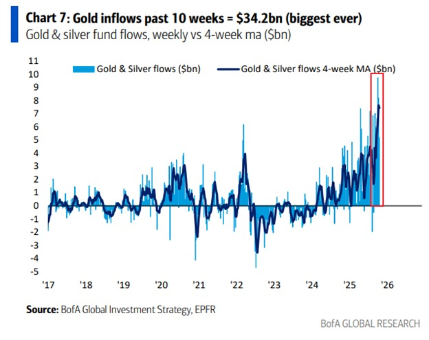 10月10日終了週において、金・銀ファンドは純流入額+82億ドルを記録し、これは史上2番目の規模となりました。