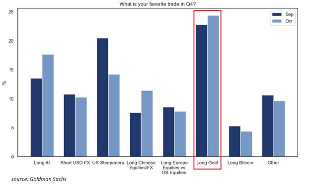 Goldmanの調査によると、回答者の約25%が「金ロング」を最も好ましい取引と回答しており、これは2か月連続で最高値を記録しています。