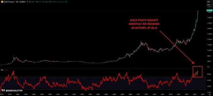 金の月次RSI指数が史上最高値となる91.8を記録しました。