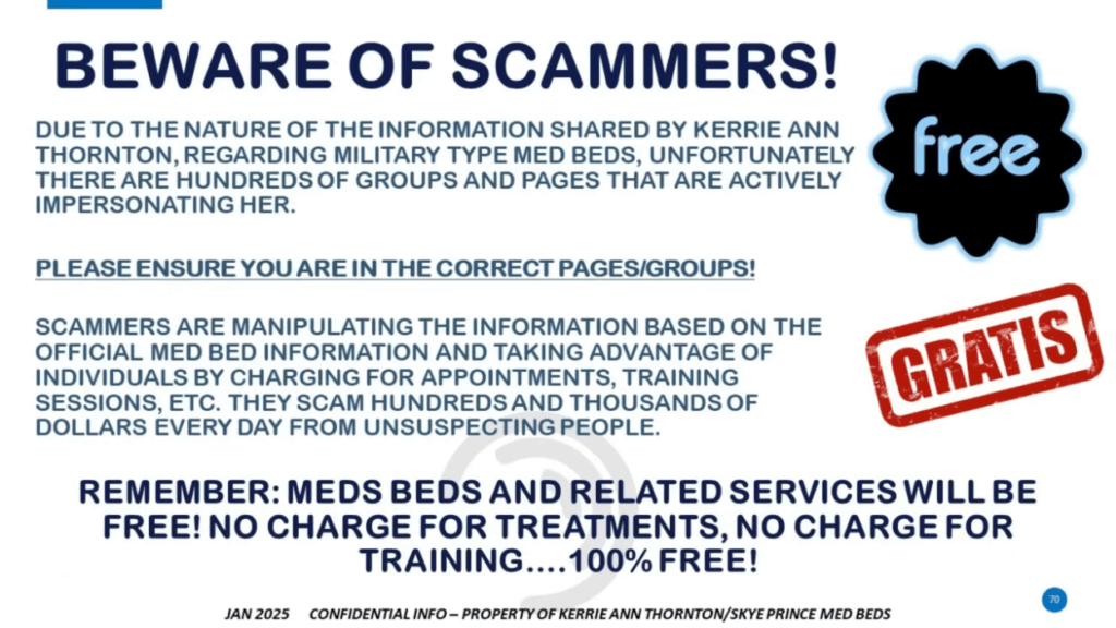 ケリー・アン・ソーントンより共有された軍事メドベッドに関する情報の性質上、残念ながら数百ものグループやページが彼女を装って活動しております。