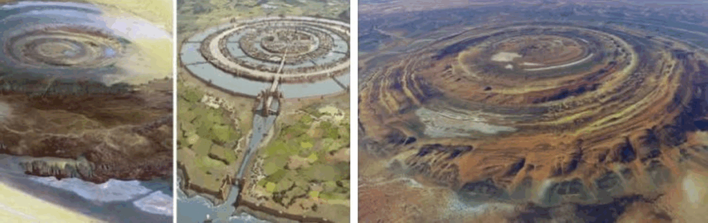 プラトンはアトランティスを、陸地と水域が交互に連なる環状の構造を持つ壮大な円形の都市として描写しています。リシャット構造はまさにこの形態を体現しており、巨大な同心円とほぼ完全な対称性を備えています。その規模の壮大さは息をのむほどであり、その形態は地球上で他に類を見ません。