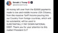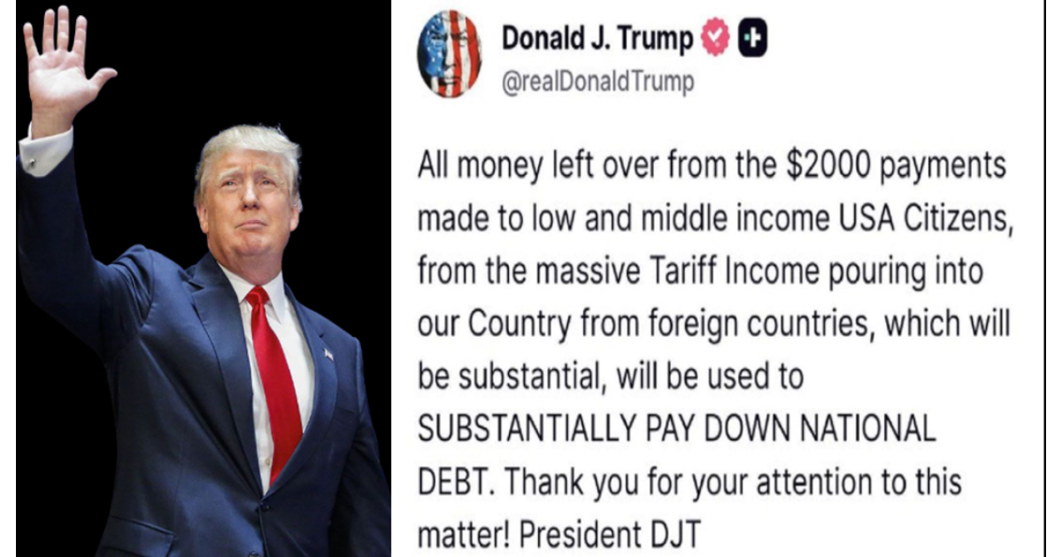 「外国から我が国に流入する巨額の関税収入により、低所得および中所得の米国市民に支払われる2000ドルの給付金から生じる余剰金は、国家債務の大幅な削減に充てられます。本件へのご配慮に感謝申し上げます。ドナルド・J・トランプ大統領」