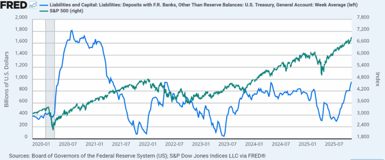 ご心配なく、米国政府機関の閉鎖はいつでも終了する可能性があります。その際には、米国財務省一般勘定(TGA)によって一時的に金融システムから引き揚げられていた流動性が、再び金融システムに流入することになります。TGA残高が減少傾向にあるたびに、株式市場は好反応を示してきました。今回も同様の展開が予想されます。ただし、時すでに遅しとならない限りは。