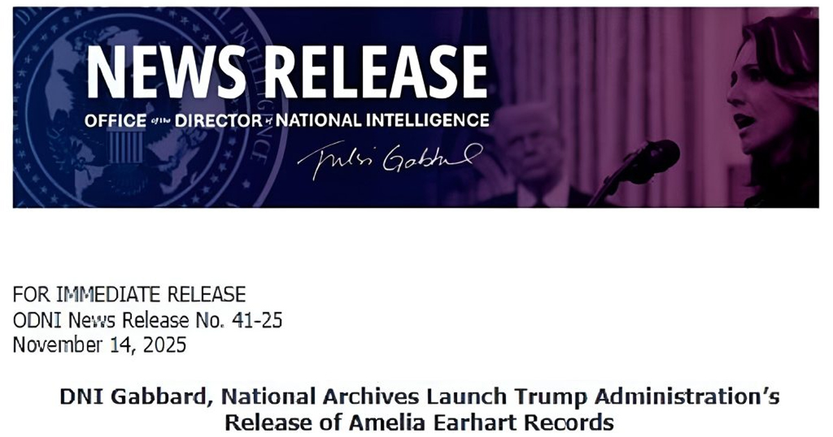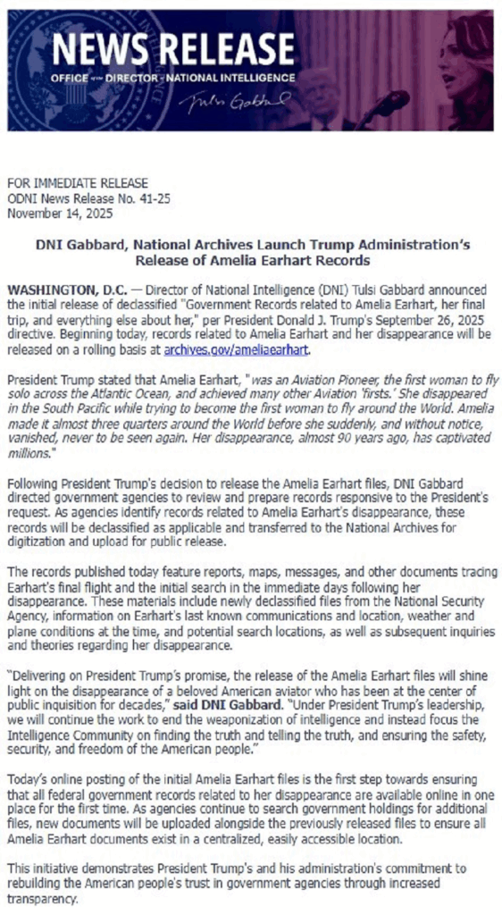 ワシントン D.C. – トゥルシー・ギャバード国家情報長官(DNI)は、ドナルド・J・トランプ氏の大統領令(2025年9月26日付)に基づき、「アメリア・イアハート、彼女の最後の旅、および彼女に関するその他すべての情報」に関する機密解除された政府記録の最初の公開を発表しました。本日より、アメリア・イアハートおよび彼女の失踪に関する記録は、archives.gov/ameliaearhart で順次公開されます。