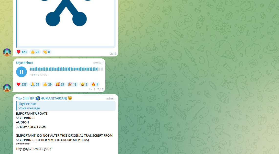 (重要:スカイ・プリンスから彼女のMMB TGグループ・メンバーへのこの原文の記録を改変しないでください)