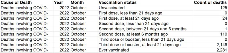 最新のデータセットの表1には、全死因死亡、COVID-19が関与した死亡、COVIDが関与しなかった死亡について、ワクチン接種の有無別に死亡率を示した数字が掲載されている。