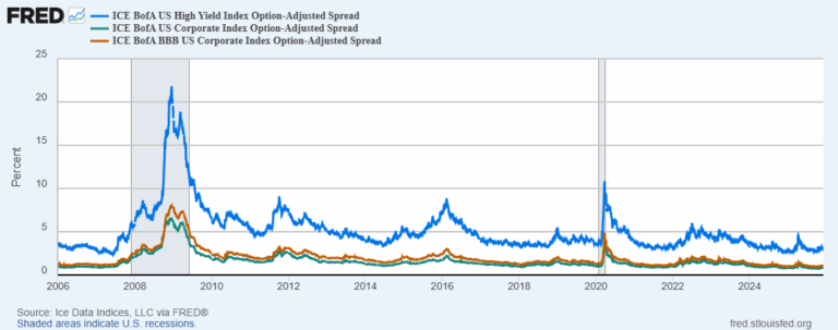 なぜ資本は、非生産的で投機的、あるいは有害とも言える投資に続いている形で配分されるのでしょうか。健全な事業を展開する企業や信用力の高い個人は、レバレッジに対する需要が限られているため、事業利益や個人所得で資金調達が可能です。しかし、銀行や資産運用会社には課題があります。それは、中央銀行による絶え間ない金融緩和の結果として、帳簿上に積み上がり続ける資本の配分を継続して行わなければならないという点です。その結果、信用力が次第に低下する企業や消費者、さらにはジャンク級に分類されるような低信用層への投資・融資を開始せざるを得ません。当然ながら、米国をはじめ主要経済圏で企業・個人破産が10年ぶりの高水準にあるにもかかわらず、クレジット・スプレッドは依然として異常に圧縮された状態が続いています。商業用不動産や自動車ローン分野などでは、2008年の世界金融危機時に記録されたピーク値を既に大幅に上回っているケースも見受けられます。