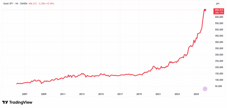 過去20年間における金に対する日本円(JPY)の価値は、90%以上下落しています。