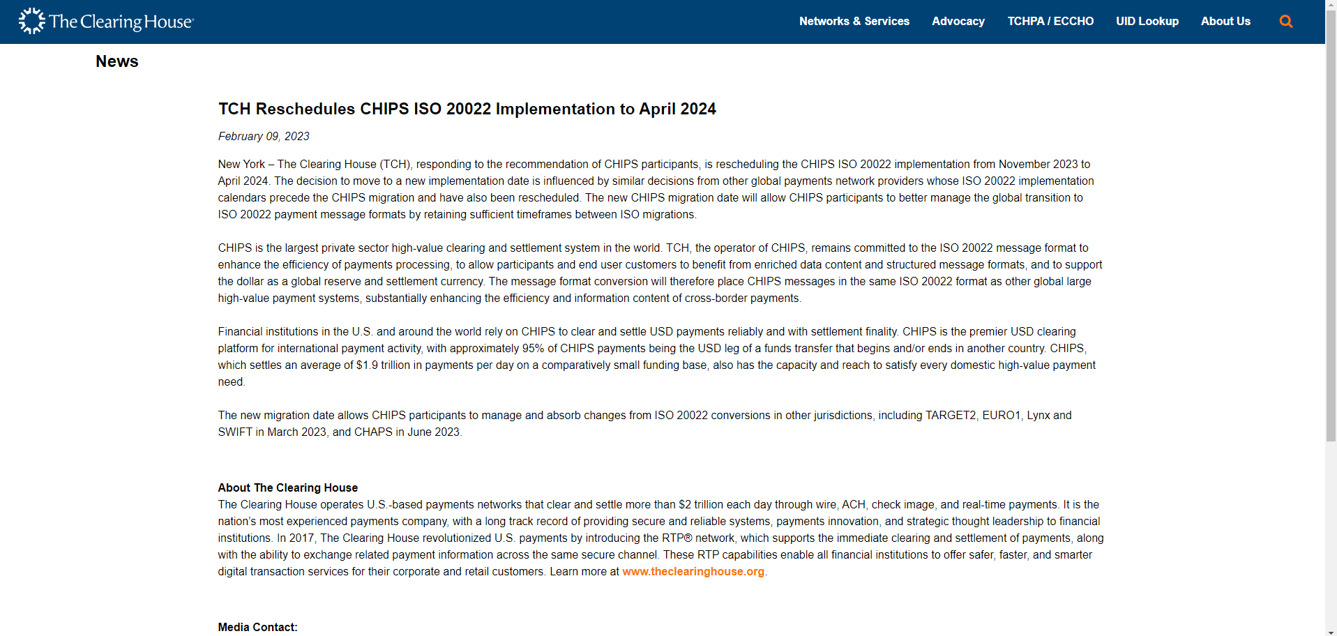 ニューヨーク – クリアリングハウス(TCH)は、CHIPS参加者の推奨に応え、CHIPS ISO 20022の実施時期を2023年11月から2024年4月に変更します。新たな実施時期への移行は、CHIPS移行に先行してISO 20022の実施スケジュールが変更された他のグローバル決済ネットワークプロバイダーの同様の決定に影響されたものです。新しい CHIPS 移行日は、CHIPS 参加者が、ISO 移行間の十分な時間枠を確保することで、ISO 20022 の決済メッセージ形式へのグローバルな移行をより適切に管理することを可能にします。
