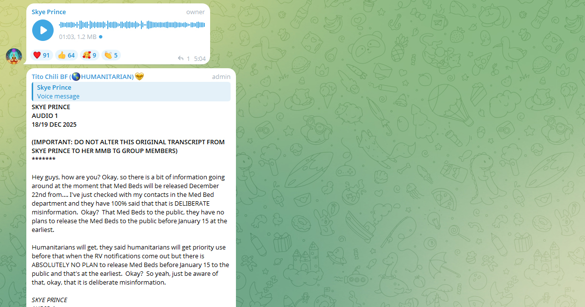 皆さん、お元気ですか?さて、現在、メドベッドが12月22日に… からリリースされるという情報が流れています。メドベッド部門の連絡先に確認したところ、100%「それは意図的な誤情報です」との回答を得ました。よろしいでしょうか?メドベッドの一般公開については、早くても1月15日以前に一般にリリースする計画は一切ありません。