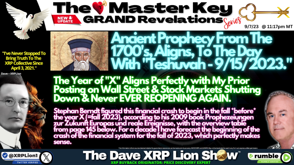 ステファン・ベルント氏は、2009年著書『ヨーロッパの未来に関する予言と現実の出来事』によると、金融危機が年X(=2023年)の秋*より前*に始まると予測しておりました。下記の145ページより引用した概要表がそれを示しております。私は10年間にわたり、金融システムの崩壊が2023年秋に始まることを予測してまいりましたが、これは完全に理にかなった見解です。