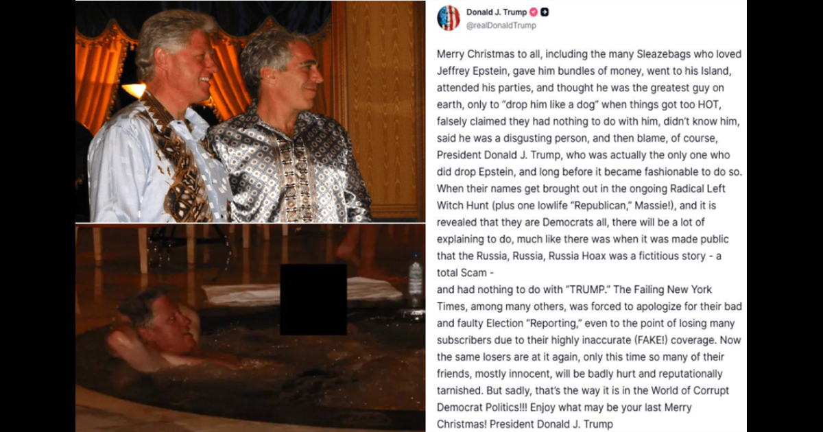 「皆様、メリー・クリスマス。ジェフリー・エプスタインを愛し、彼に多額の資金を提供し、彼の島を訪れ、彼のパーティーに参加した多くの卑劣な連中も含めてね」とトランプ大統領は記しました。「彼らは彼をこの世で最高の男だと思い込んでいたのに、事態が熱くなりすぎると『犬のように見捨てた』のです!」