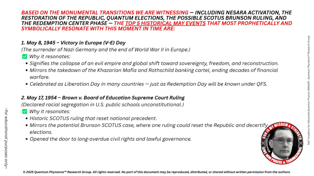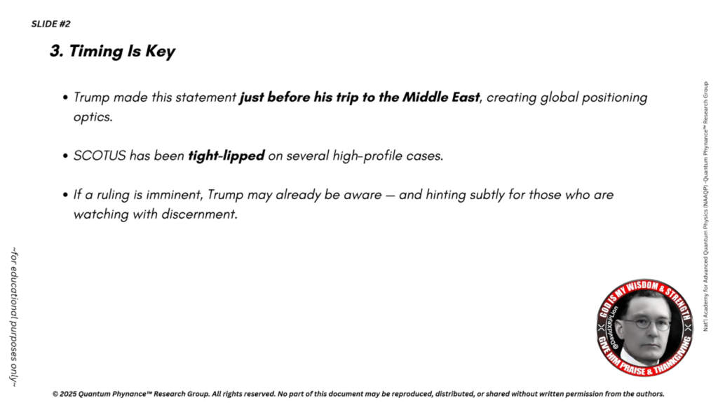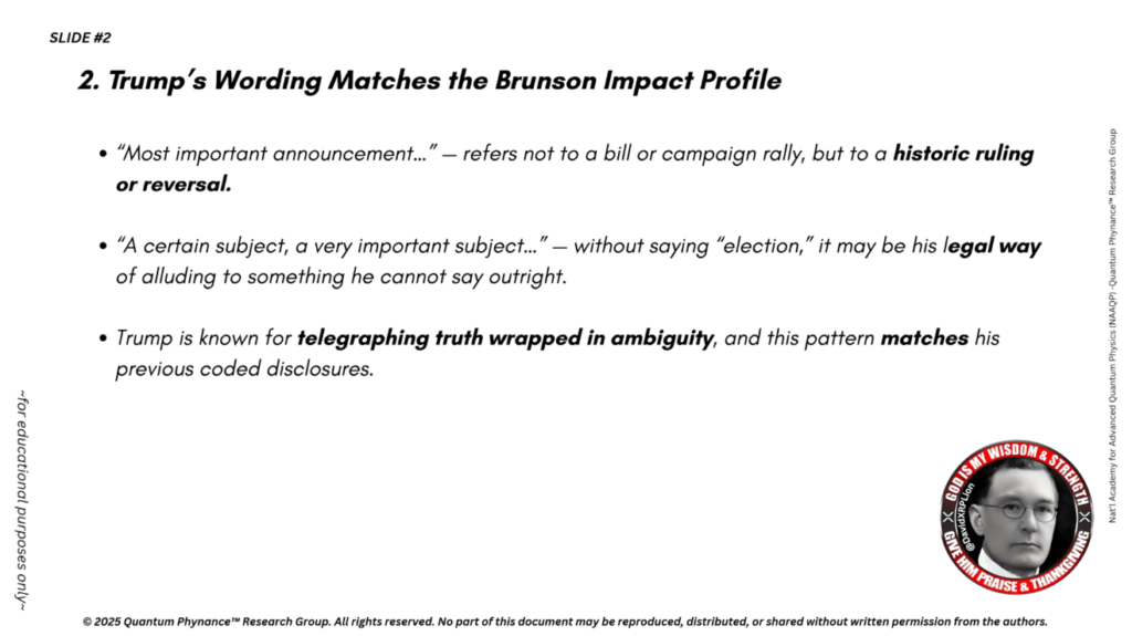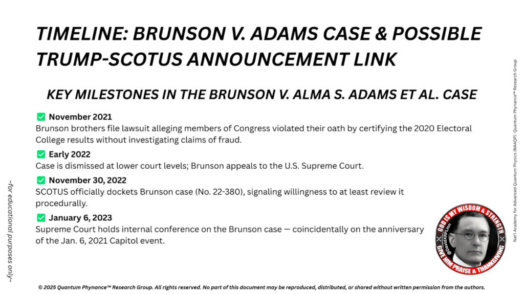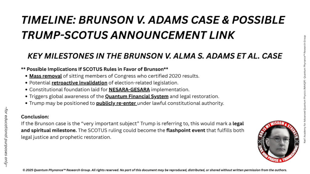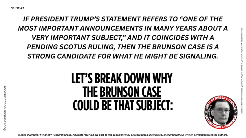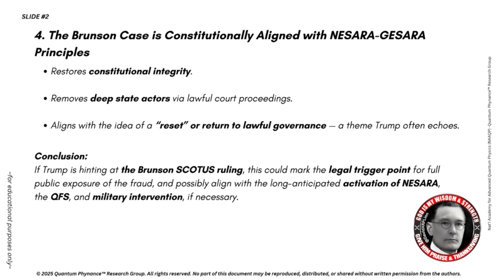 トランプ氏がブルンソン最高裁判決に言及されているとすれば、これは詐欺行為の完全な公的暴露に向けた法的引き金となる可能性があり、必要に応じて長らく待ち望まれてきたNESARAの発動、QFS、そして軍事介入と連動するかもしれません。
