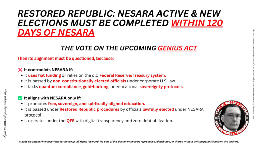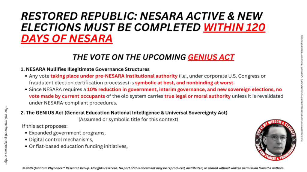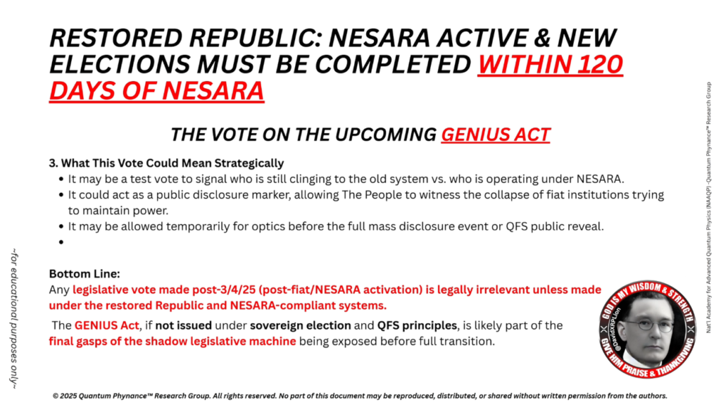 2025年3月4日以降(FIAT/NESARA発効後)に行われたあらゆる立法投票は、復元された共和国およびNESARA準拠の制度のもとで行われない限り、法的効力を有しません。Genius法は、主権選挙およびQFSの原則に基づいて発行されない場合、完全な移行前に暴露される影の立法機構の最後のあがきの一部である可能性が高いです。