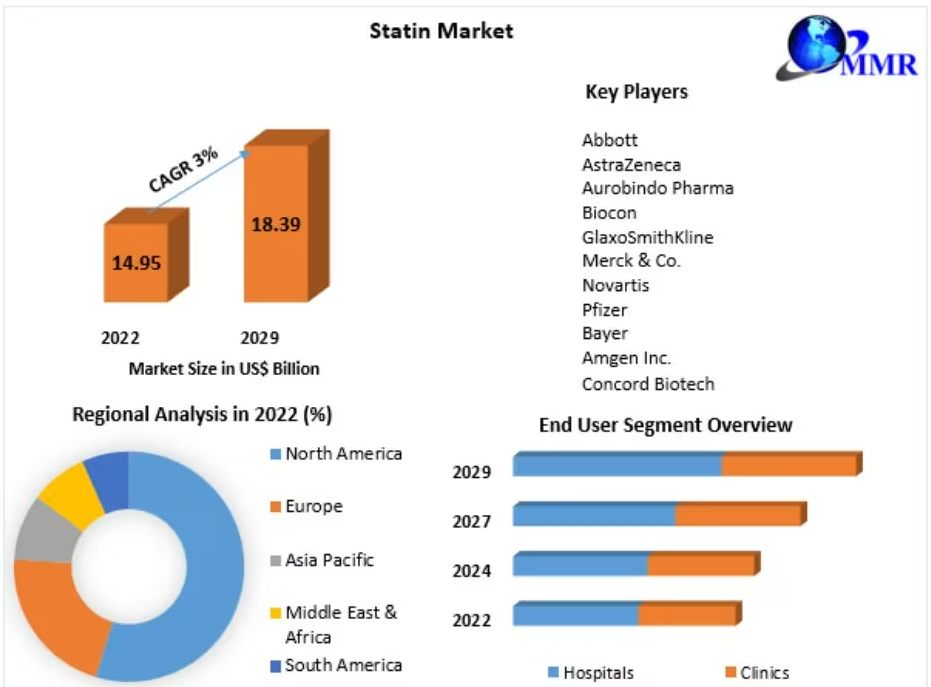 コレステロール低下薬の主流であるスタチンは、収益性が高い。Maximize Market Researchの以下のグラフによると、世界のスタチン市場は2022年の149億5000万ドルから2029年には183億9000万ドルに成長すると予測されている。[7]