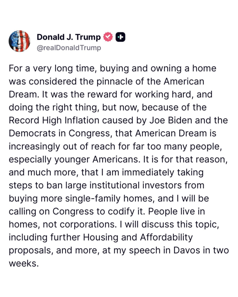 「私としては、直ちに大規模な機関投資家による一戸建て住宅の追加購入を禁止する措置を講じるとともに、議会に対しこれを法制化するよう要請する所存です。住宅に住むのは人々であって、企業ではありません」