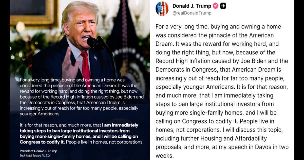 ドナルド・J・トランプ氏大統領は、アメリカン・ドリームを守るための大胆な新施策として、ウォール街とグローバリスト系不動産カルテルを直接的に標的にしました。2026年1月7日、トランプ大統領は機関投資家が労働者階級の家族から一戸建て住宅を奪うことを阻止すると誓約しました。「住宅に住むのは人々であって、企業ではありません」