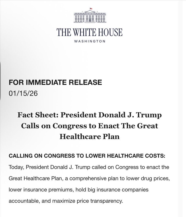 ドナルド・J・トランプ氏は、医薬品価格の引き下げ、保険料の削減、大手保険会社の責任追及、価格透明性の最大化を目的とした包括的な計画である「偉大なる医療計画」の成立を議会に要請しました。
