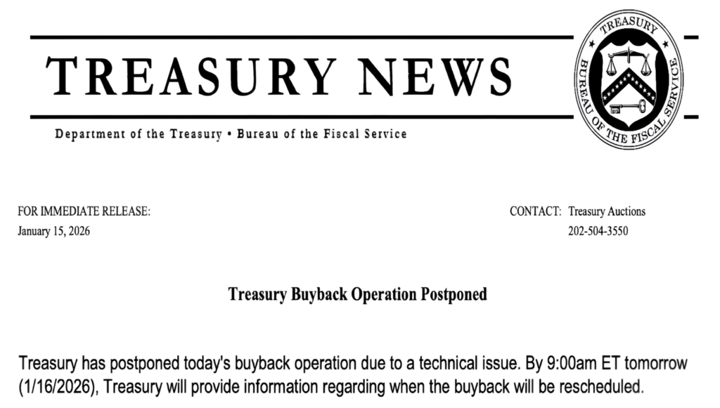 2026年1月15日、事前の市場シグナルなしに、米国財務省は予定されていた40億ドルの債券買い戻しを静かに中止しました。その理由として「技術的な問題」を挙げております。詳細な説明はなく、具体的な内訳も示されませんでした。ただ漠然とした説明文と、「明日午前9時までに」追加情報を提供するとの約束のみが示されたのでした。