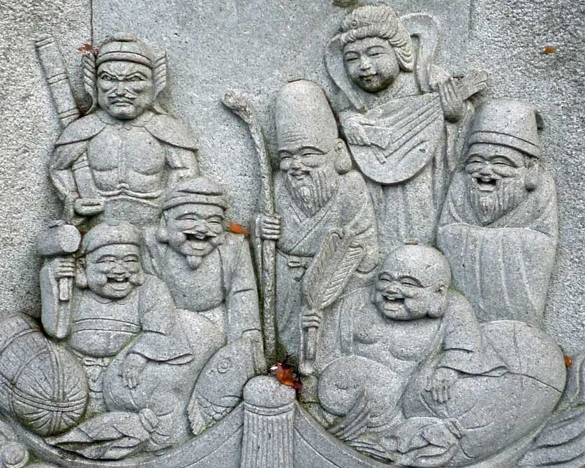 ~ 布袋:中国の布袋仙人に由来し、笑う仏様として知られ、満足と豊穣の神で、袋を携えています。