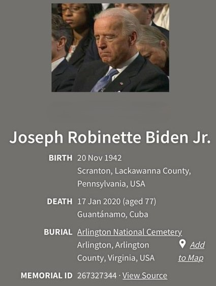 ジョセフ・ロビネット・バイデン・ジュニア氏は、1942年11月20日にペンシルベニア州スクラントンにて誕生しましたが、2020年1月17日、グアンタナモ湾における裁判及び処刑を経て、自由な個人として、また政治的存在として、正式かつ不可逆的にその存在を終えました。これは、以下の軍事法廷手続きに基づき執行されたものです。