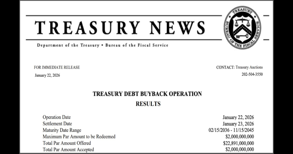 2026年1月22日、米国財務省は、自国政府債務を20億ドル相当買い戻したことを確認しました。