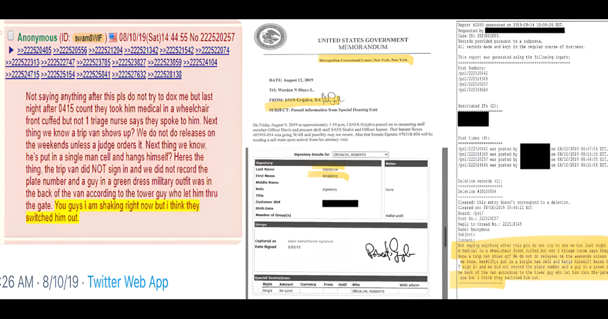 エプスタイン事件におけるこれまでの最大の衝撃的な展開:彼の自殺とされる直前に投稿された匿名の4Chanの投稿が確認され、メトロポリタン矯正センターの職員ロベルト・グリハルバ氏に特定されました。