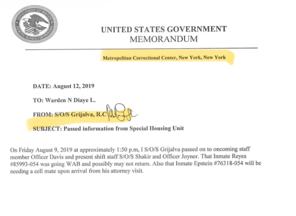 エプスタイン氏の死亡から2日後となる2019年8月12日、グリハルバ警官は連邦拘置所(MCC)所長宛てに署名入り覚書を提出しました。その内容は以下の通りです: