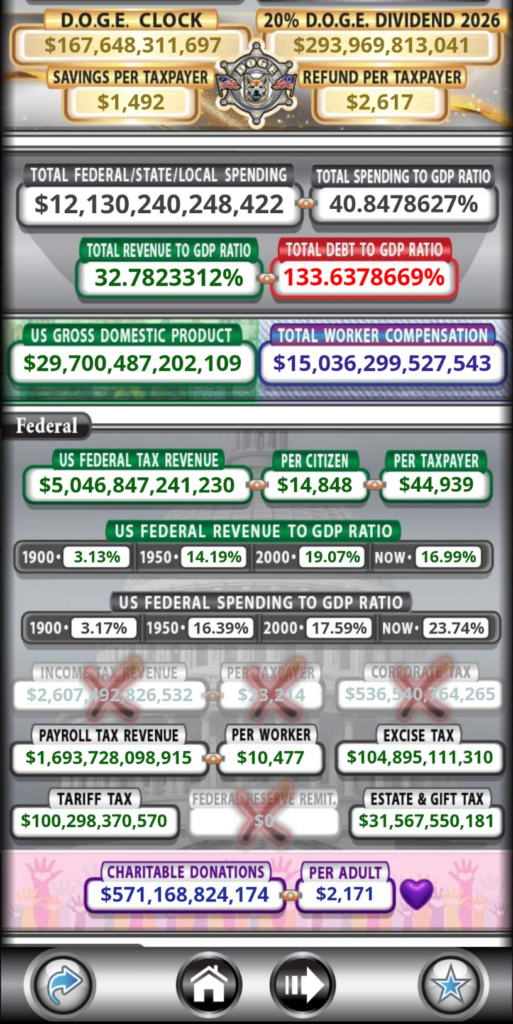 この変革は理論上のものではありません。現在の米国債務時計の変動がこの転換を裏付けています。所得税と法人税が計算式から除外されたことは、課税制度そのものが抜本的に見直されている直接的な証拠です。Dogecoinと納税者の貯蓄がリストアップされたことも重要な兆候であり、新たな金融モデルはもはやFIATの操作に依存せず、現実世界と分散型資産に根ざしているのです。