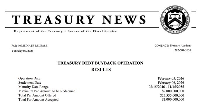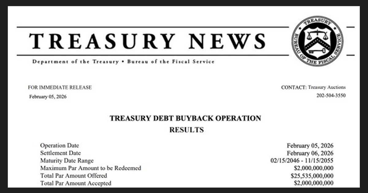 2026年2月5日、財務省は2046年から2055年にかけて満期を迎える長期国債20億ドルの買い戻しを正式に発表しました。これは同週前半に実施された40億ドルの買い戻しに続くもので、これにより国債の政府による再吸収総額は60億ドルに達しました。