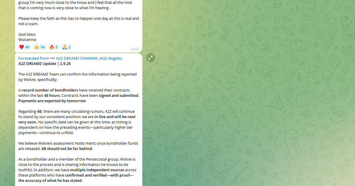 皆様、私たち情報提供者は単なる伝達役であることをお忘れなく。誰もこの状況を制御できず、何も保証できません。ただし、私は債券保有者でありペンテコステ派グループの一員として、非常に近い立場にいます。現在出回っている情報は、私が耳にしている内容と極めて近いと感じています。