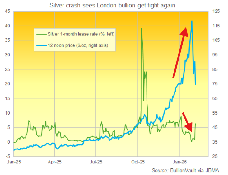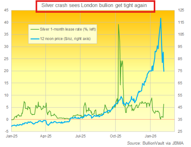 しかしこれは吸血鬼のような手口でした。システムの一部に生命維持装置を装着させるため、別の部分から生命の源を吸い取る行為です。しかしその後の展開はさらに示唆に富んでいます。暴落後の数日間、SLVの発行済み株数は強い需要により約5億8000万株まで回復しました。銀行は1月に事実上枯渇させた金属を返還せざるを得なかったのです。このETF補充の争奪戦が直接もたらした結果とは? SLVの金地金が保管されているロンドンにおけるリース料が、LBMAが危機的状況に陥った10月以来の最高水準に急騰したことです。