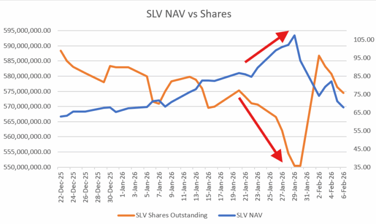 この金属は金融システムに残された唯一の緩衝材でした。月末契約における壊滅的な納品不履行に直面した地金銀行は、公開市場でSLV株を買い付け、それらを現物地金のバスケットと交換し、ロンドン(SLVの現物地金が保管されている場所)における差し迫った義務を履行するためにそれらの地金を利用していました。