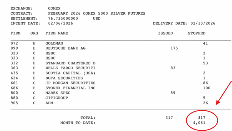 操作は価格を歪めることはできても、現物の金属を生み出すことはできません。チャートや操作が絶望的な状況を示している一方で、重要な3月限月の納品月に向けて明らかになる冷徹な在庫データは、数学的な必然性による終末的な状況を描き出しています。これは、銀に対する紙の請求権が、これまでに見たこともないほど物理的な現実に完全に圧倒している市場の実態を明らかにしています。警告の銃声が今まさに、2月に鳴り響いています。今月の最初の6営業日だけで、驚異的な98%のオープン・インタレストが即時現物受渡を要求しています。買い手は将来の投機のために契約を繰り越しているのではなく、前例のない結束で「現物を渡せ!」と叫んでいるのです。背景として、2025年2月全体の現物決済量は合計2400万オンスでした。わずか1週間足らずで既に2000万オンスに達しており、このペースは紙の決済に対する根本的な信頼喪失を示唆しています。