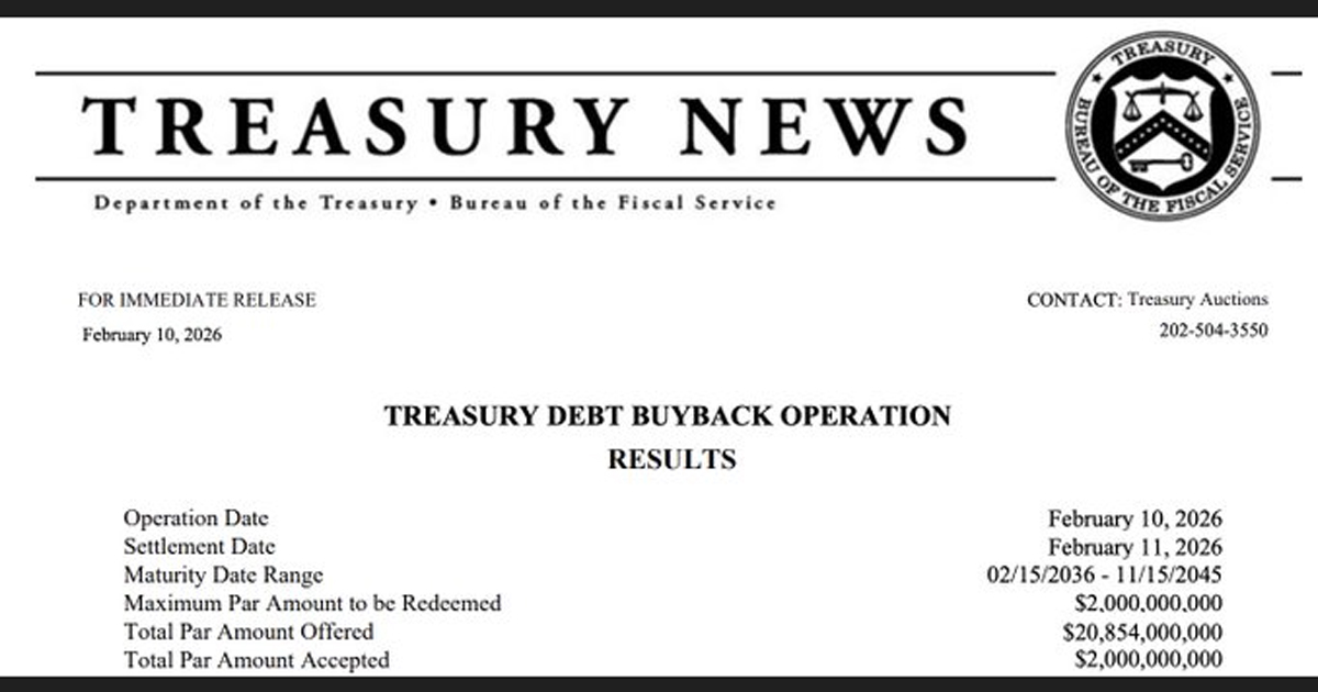 2026年2月10日、米国財務省は債務買い戻しオペレーションを実施しました。2036年から2045年にかけて満期を迎える自国債を20億ドル分購入したのです。ウォール街は肩をすくめ、主流メディアはぼそぼそと報じたものの、実際のところこれは単なる会計上の調整ではなかったのです。