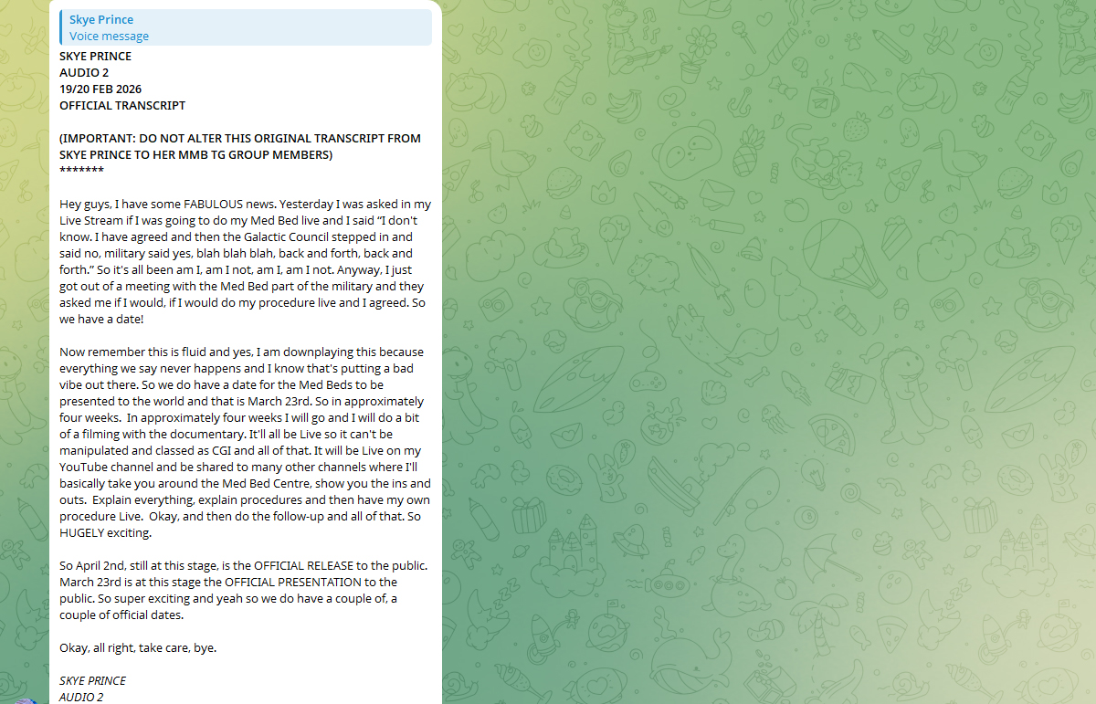 皆様、素晴らしいお知らせがございます。昨日、ライブ配信中にメドベッドの実演を行うかどうかお尋ねいただき、私は「分かりません。承諾したものの、銀河評議会が介入して反対し、軍は賛成で… といった具合に、何度も何度も意見が交錯していました」という状況でした。つまり、やるのかやらないのか、ずっと揺れ動いていたわけです。さて、先ほど軍側のメドベッド担当部署との打ち合わせを終えたところ、彼らが「施術をライブで公開していただけませんか」と打診され、私は承諾いたしました。つまり、日程が決まったのです!
